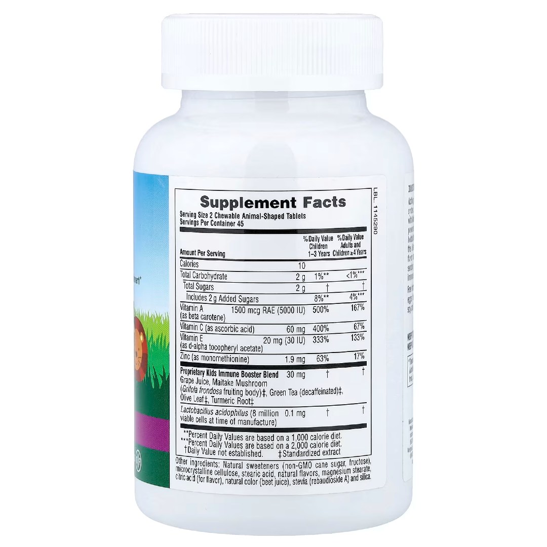 Формула поєднує вітаміни A, C, E, цинк, рослинні екстракти та пробіотики у зручному форматі жувальних вітамінів.