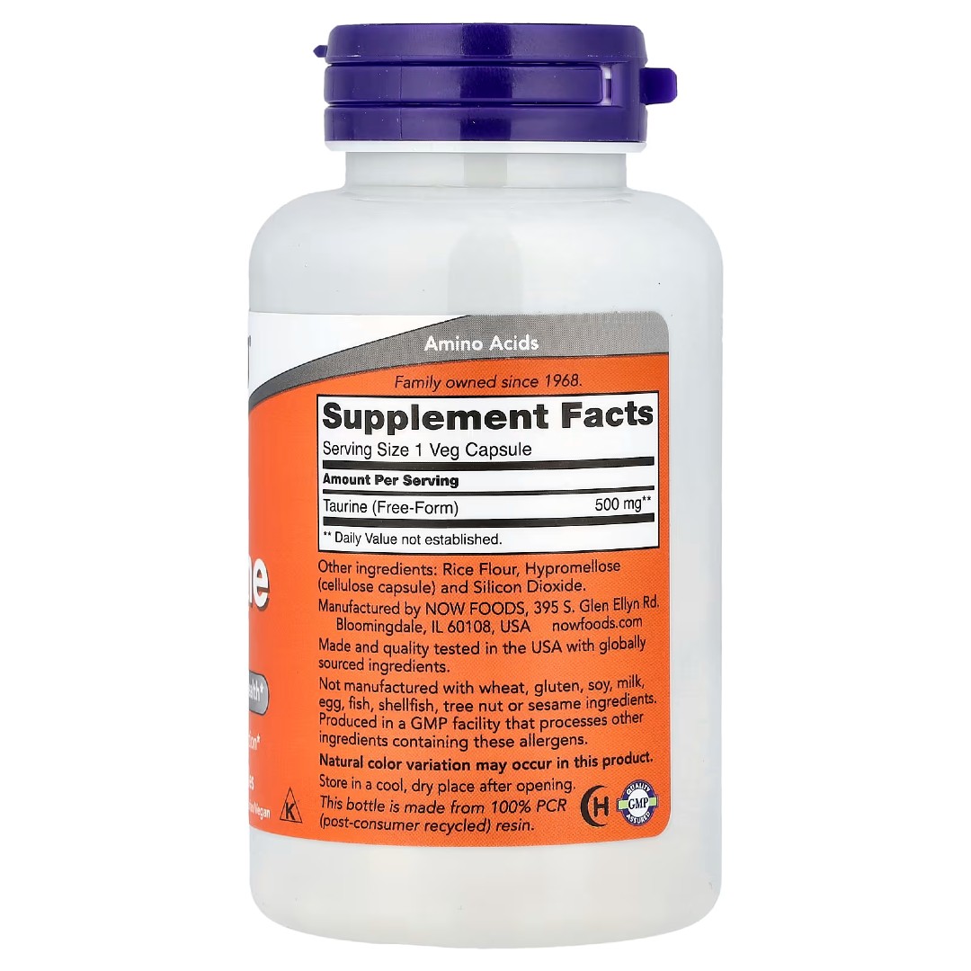 NOW Foods Taurine 500 мг — амінокислотний комплекс у капсулах для щоденного доповнення раціону. Таурин природно міститься у тканинах організму та використовується у повсякденному харчуванні.