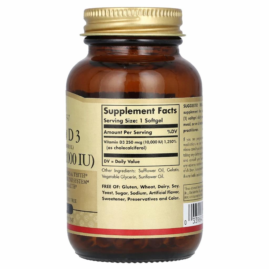 Solgar Vitamin D3 (Cholecalciferol) 250 мкг — вітамінний комплекс з вітаміном D3 у зручному форматі м’яких капсул. Формула розроблена для щоденного доповнення раціону дорослих та регулярного використання у повсякденному режимі харчування.