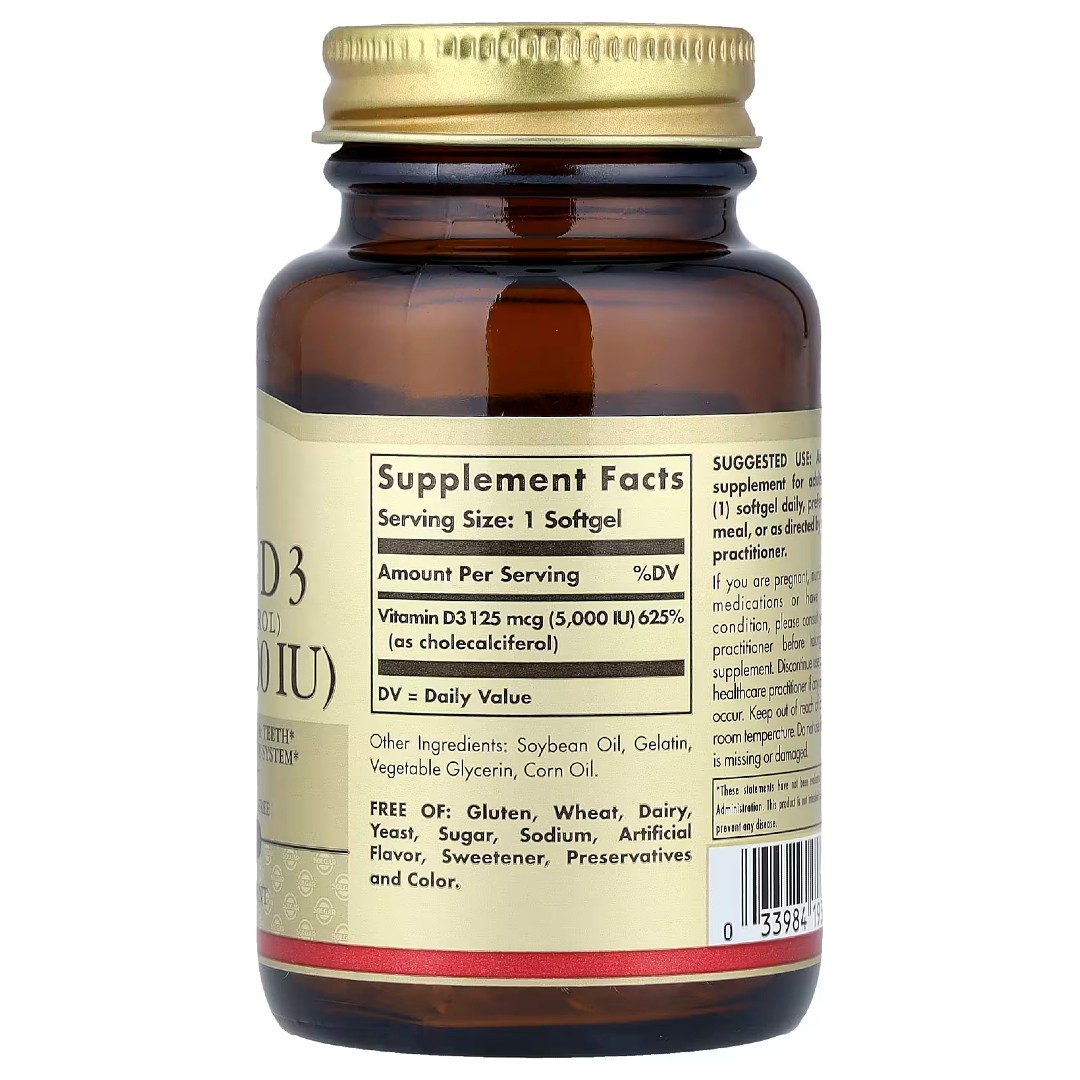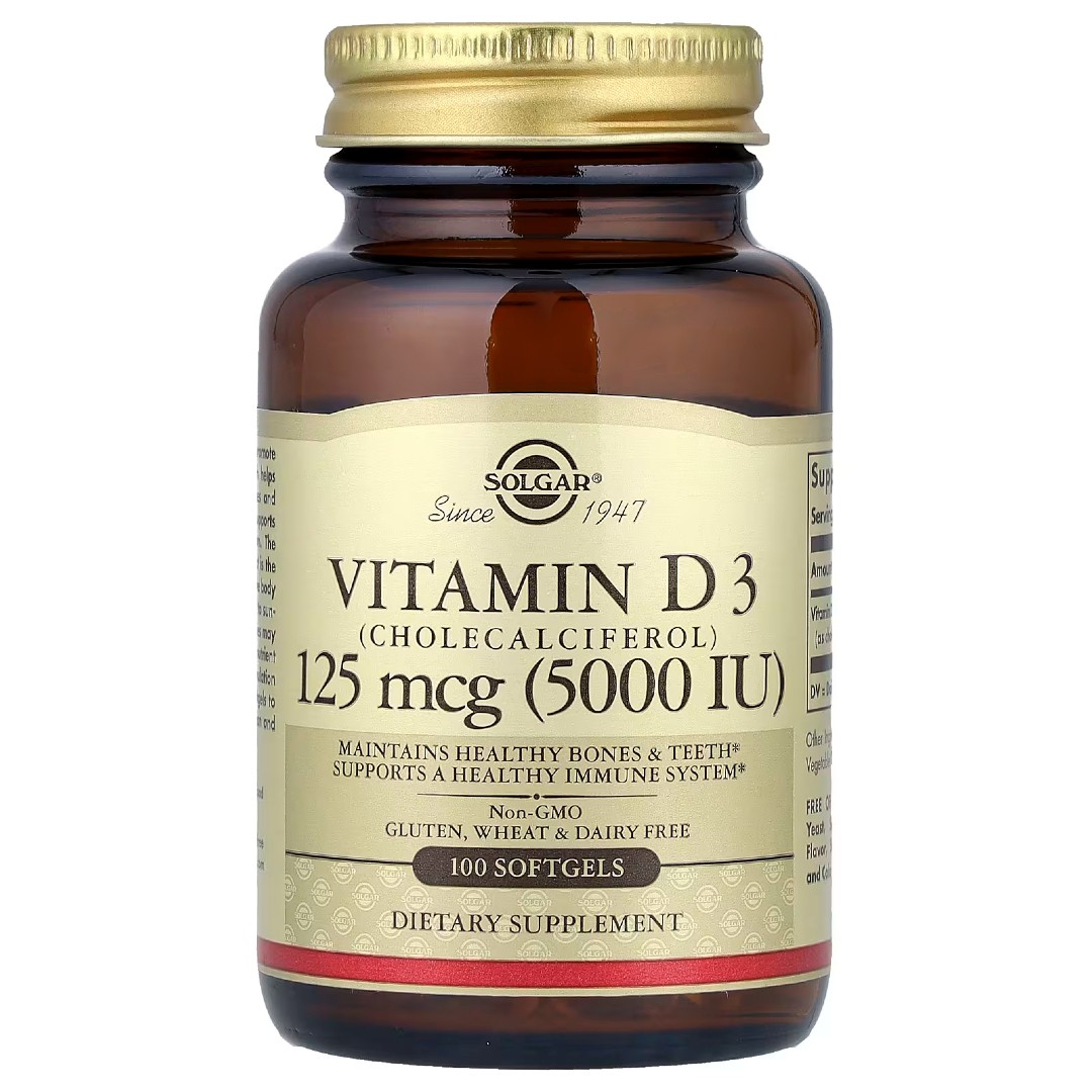 Solgar Vitamin D3 (Cholecalciferol) 125 мкг — вітамінний комплекс у формі м’яких капсул на олійній основі. Формула створена для щоденного доповнення раціону дорослих та зручного регулярного використання.